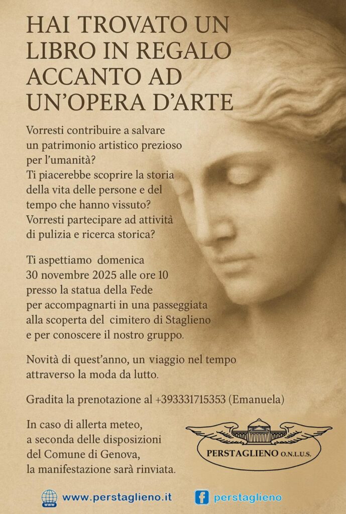Anche questo anno l’Associazione per Staglieno, in occasione della Festa di Ognissanti e della Commemorazione dei Defunti, propone lungo il percorso dei porticati inferiori del cimitero di Staglieno, la possibilità di prelevare gratuitamente dei libri posti accanto alle sculture. All’interno dei libri troverete un invito a partecipare ad una passeggiata culturale che si terrà all’interno del cimitero Domenica 30 novembre 2025 alle ore 10 con appuntamento dalla statua della Fede. I libri rimasti saranno ritirati sabato 8 novembre, per cui affrettatevi!