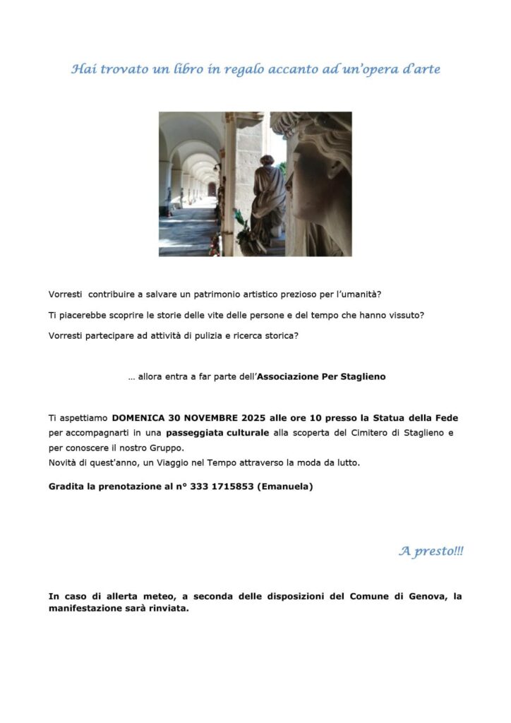 Anche questo anno l’Associazione per Staglieno, in occasione della Festa di Ognissanti e della Commemorazione dei Defunti, propone lungo il percorso dei porticati inferiori del cimitero di Staglieno, la possibilità di prelevare gratuitamente dei libri posti accanto alle sculture. All’interno dei libri troverete un invito a partecipare ad una passeggiata culturale che si terrà all’interno del cimitero Domenica 30 novembre 2025 alle ore 10 con appuntamento dalla statua della Fede. Saranno con noi anche gli amici di Time Travels. I libri rimasti saranno ritirati sabato 8 novembre, per cui affrettatevi!